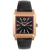 - Mineral crystal; Polished rose gold tone stainless steel case; Black leather strap